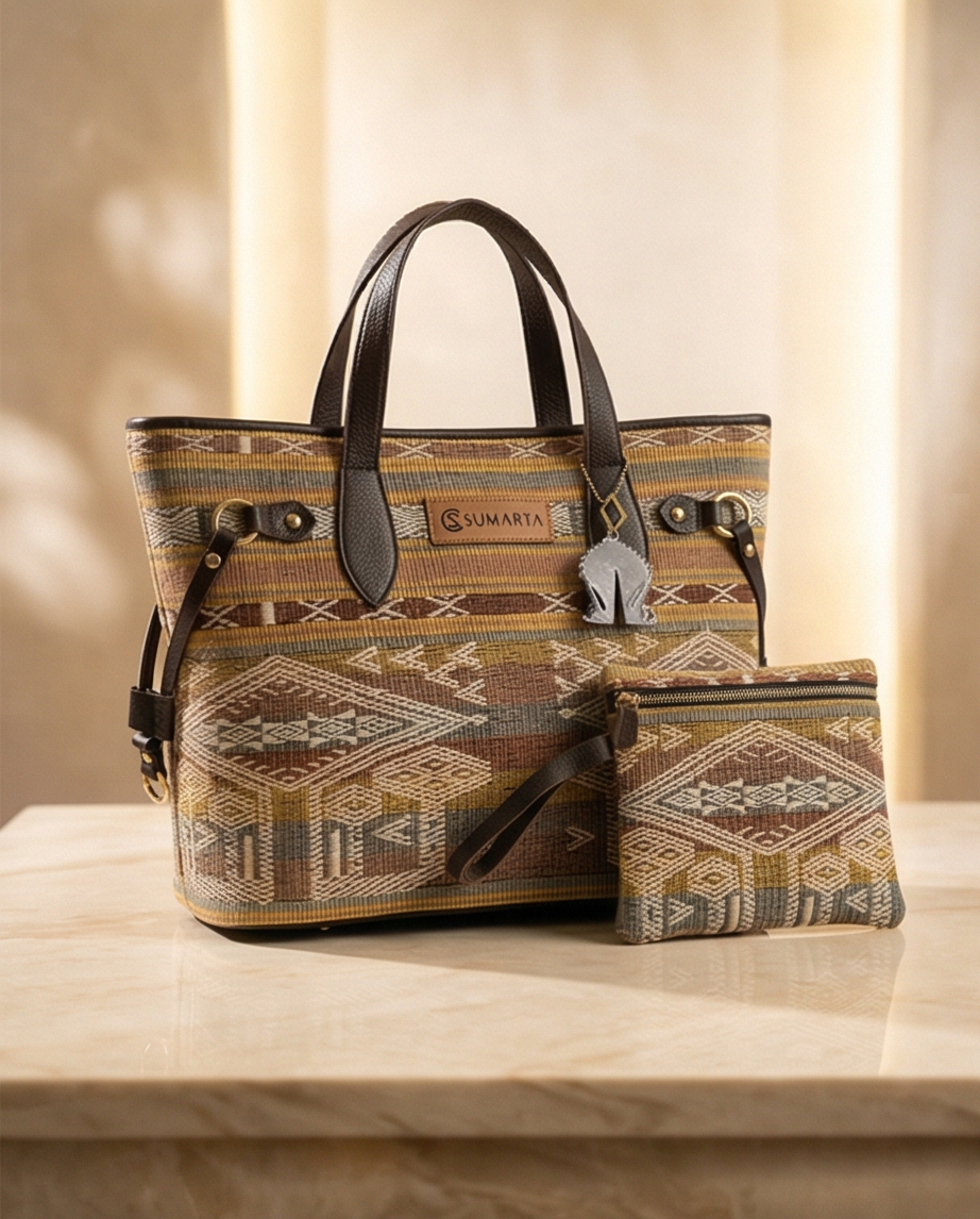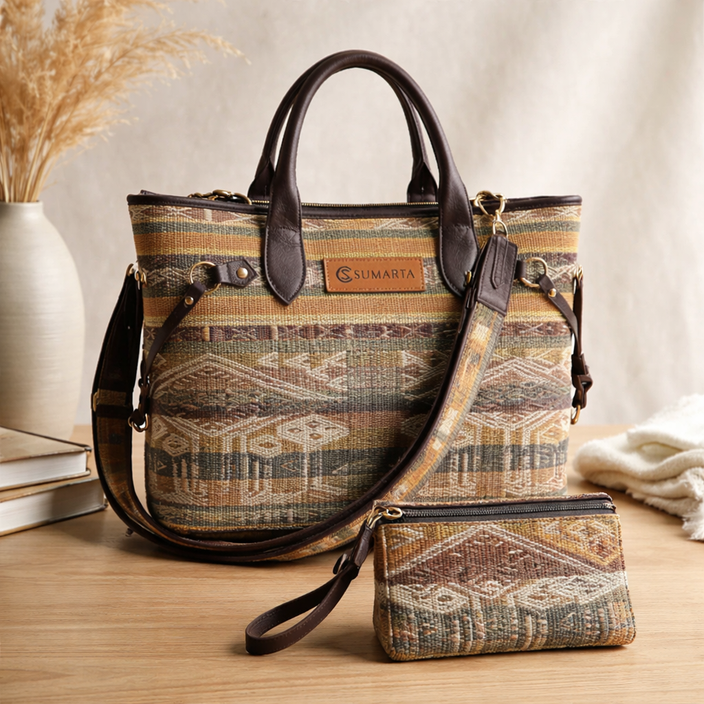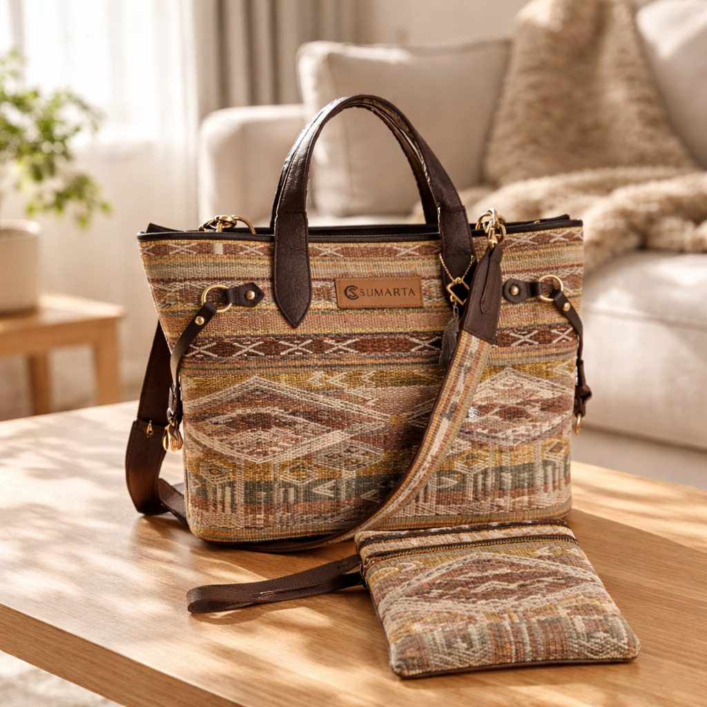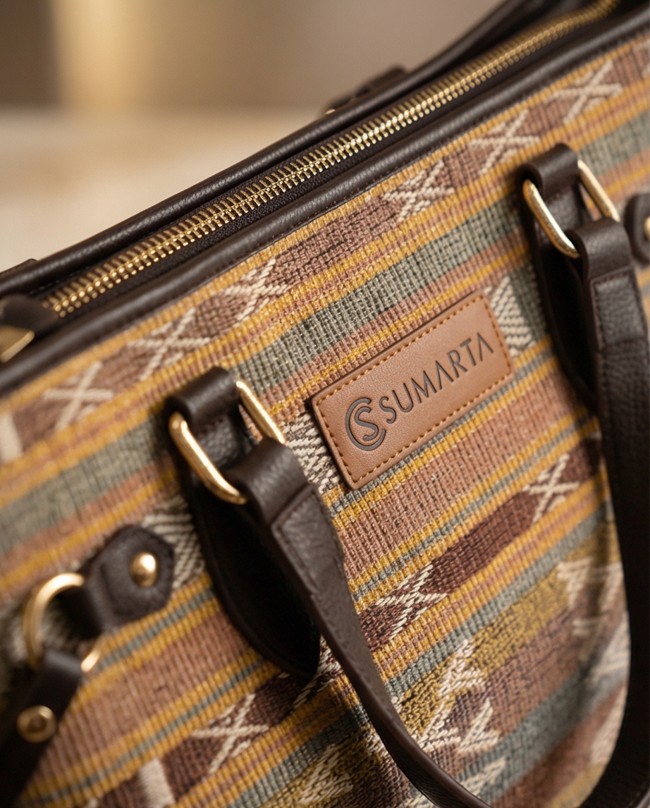 Handgemaakte tote bag van authentieke tenun en hoogwaardig leer.